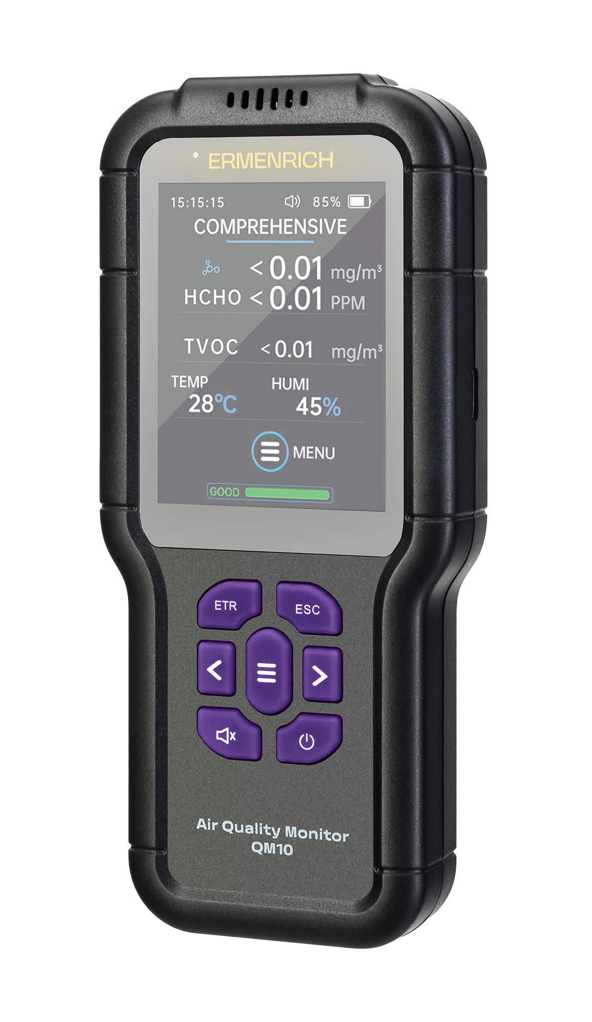 Miernik zanieczyszczenia powietrza Ermenrich QM10 to ręczny przyrząd do analizy składu powietrza w pomieszczeniach, wykrywania podwyższonych poziomów szkodliwych substancji i monitorowania mikroklimatu. Może być stosowany w warunkach domowych i komercyjnych – biurach, hotelach, szkołach i przedszkolach, kawiarniach, sklepach itp., ale nie do celów przemysłowych, ponieważ zakres pomiaru TVOC (lotnych związków organicznych) wynosi 0,0–10,0 mg/m3, co jest wartością niewystarczającą do wykrywania wyższych stężeń, które są powszechnie spotykane w warunkach przemysłowych.