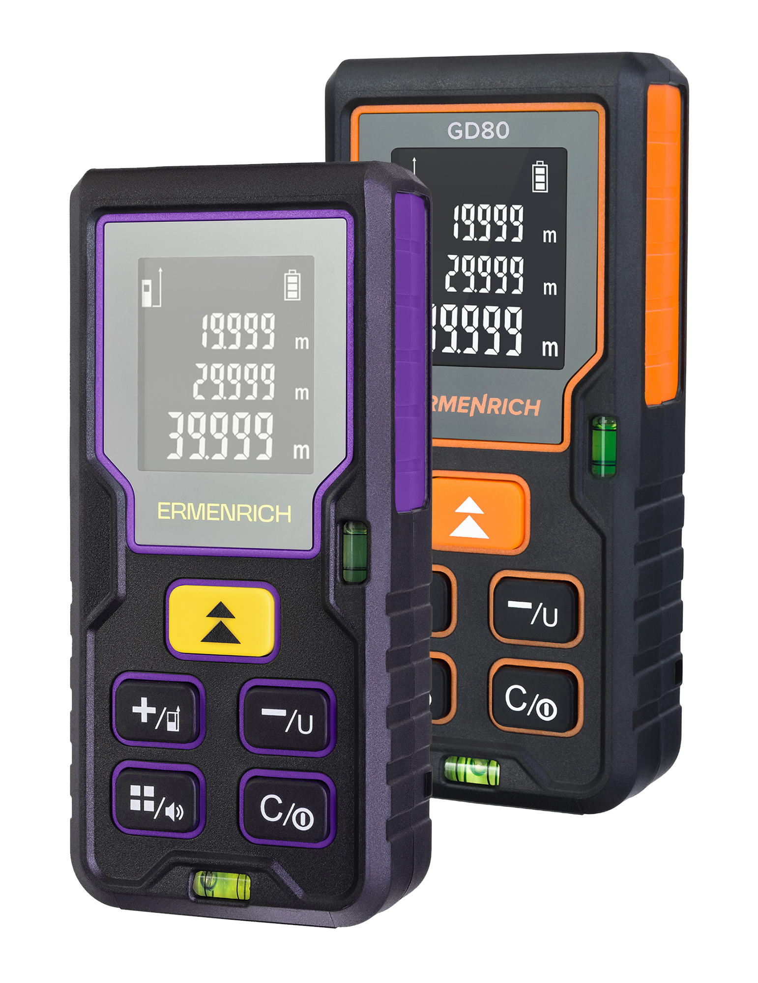 Ermenrich Reel PLUS GD80 to ergonomiczne i niewielkie urządzenie z wygodnie umieszczonymi przyciskami sterowania. Urządzenie jest zasilane 2 bateriami AAA. Jeden zestaw baterii wystarcza na ponad 5000 pomiarów. Funkcja automatycznego wyłączania lasera i samego urządzenia pomaga oszczędzać baterie. Dalmierz laserowy może zapisać do 20 grup danych w celu rejestrowania wyników pracy. Profesjonaliści docenią tryb cichy umożliwiający wykonywanie pomiarów w ciszy bez dźwięków alarmów.
