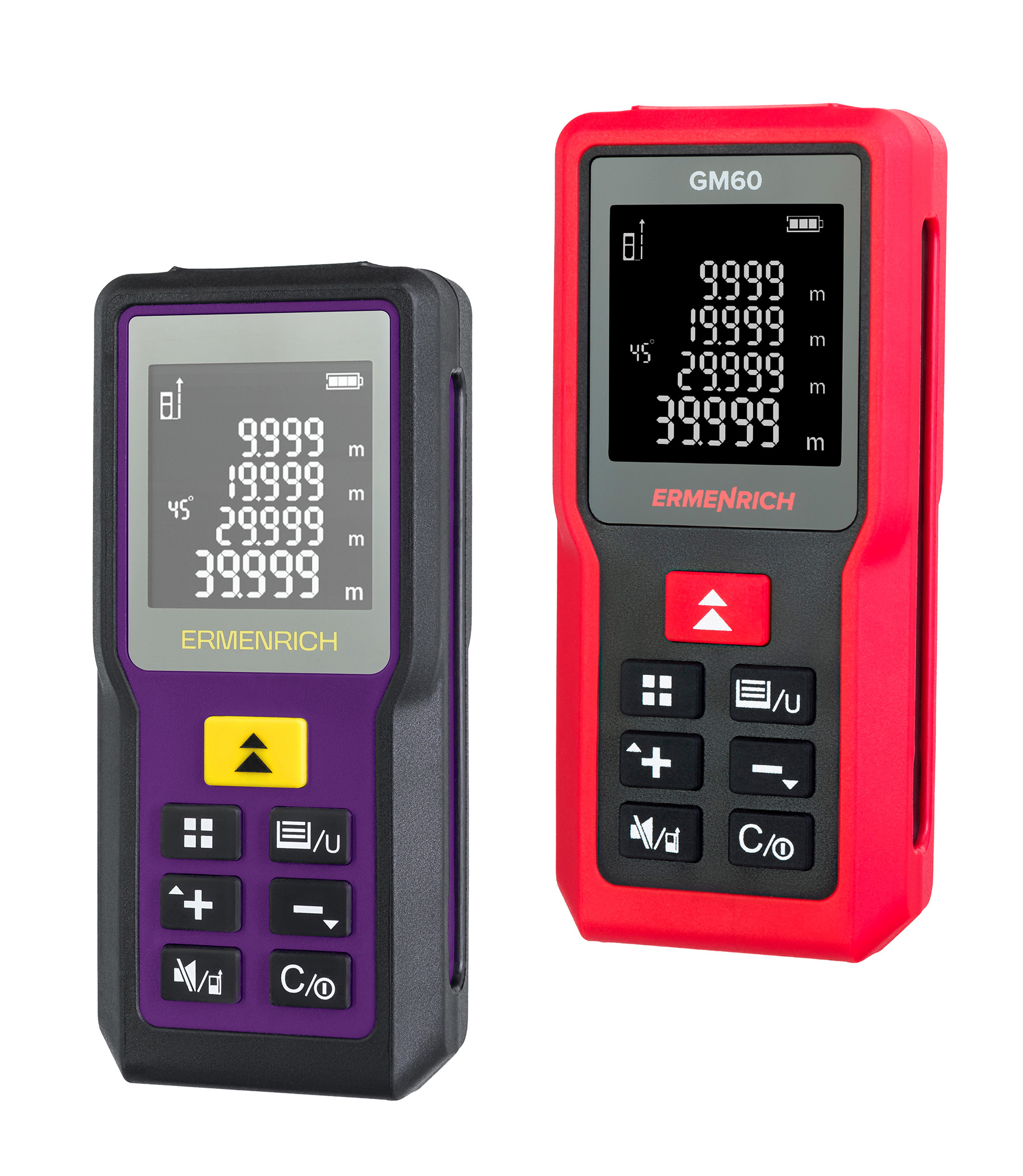 Ermenrich Reel PRO GM60 jest łatwy w obsłudze dzięki niewielkiemu rozmiarowi i dużemu wyświetlaczowi z 4 wierszami. Dostępne są tryby pojedynczego pomiaru odległości i pomiarów ciągłych, a także wybór szeregu różnych jednostek miar. Profesjonaliści docenią jego tryb cichy – umożliwia on pracę w całkowitej ciszy przez wyłączenie alarmów dźwiękowych. Przyrząd jest zasilany 2 standardowymi bateriami AAA, a jeden zestaw baterii starcza na ponad 5000 pomiarów. W celu oszczędzania energii dalmierz jest wyposażony w funkcję automatycznego wyłączania lasera i samego urządzenia. Rejestr historii urządzenia pozwala na przechowywanie dużych ilości danych – 100 grup.