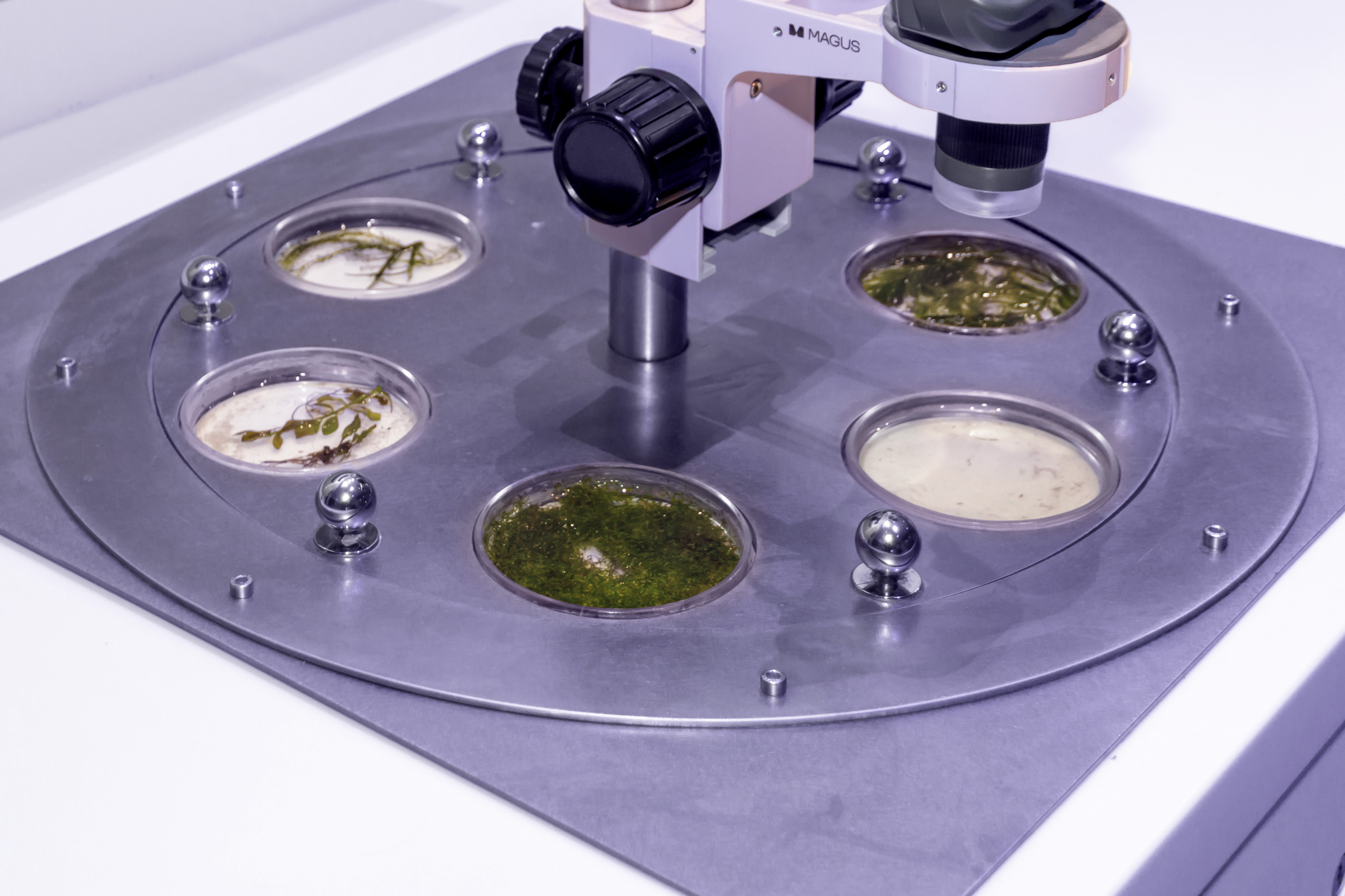 Stanowiska badawcze wyposażone są w mikroskopy stereoskopowe, kamery cyfrowe i ekrany. Dzięki takiej konstrukcji każda osoba odwiedzająca może korzystać z mikroskopu, samodzielnie zmieniać preparaty oraz oglądać próbki tkanek i mikroorganizmów na dużym ekranie.